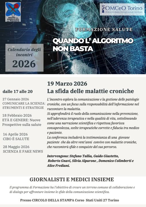 Era uno degli impegni assunti al momento del rinnovo della “Carta di Torino 2025” e ora l’Ordine dei Giornalisti del Piemonte e l’Ordine dei Medici della provincia di Torino avviano un progetto di formazione comune sull’informazione medico-scientifica. Cinque incontri, uno al mese, nei quali saranno messe a confronto le diverse prospettive dalle quali muovono le due categorie, frequentemente alle prese con delicate questioni etiche e deontologiche. Gli argomenti spazieranno dalle fake-news in ambito scientifico ai temi di età e genere, fino all’alimentazione e alle malattie croniche. È questo il primo risultato del tavolo di lavoro permanente costituito al momento della firma della Carta di Torino e per questo gli incontri si incentreranno sulla necessità di trovare corretti canali di comunicazione tra i professionisti per potere essere puntuali nell’informazione promuovendo anche stili di vita salutari.